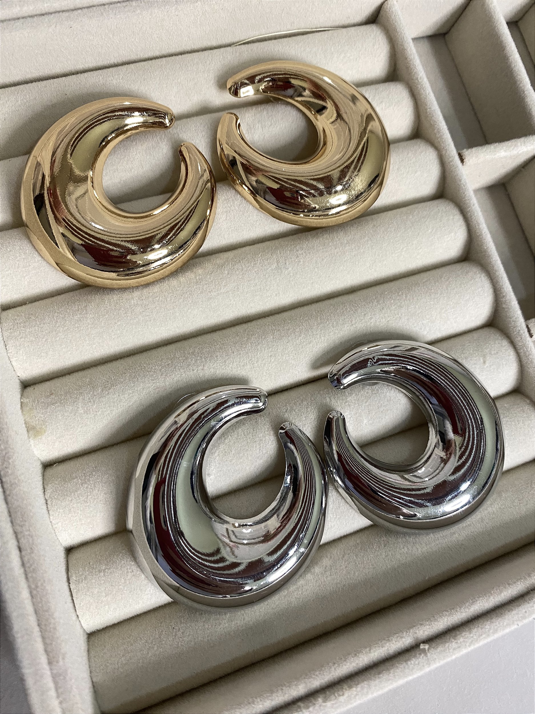 Brinco Meia Lua com duas opções de banho, dourado ou prateado.